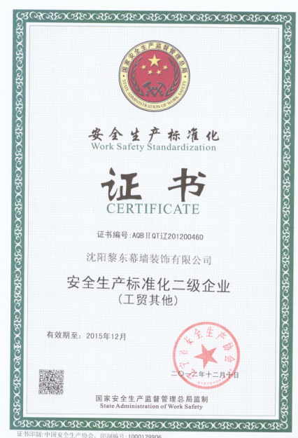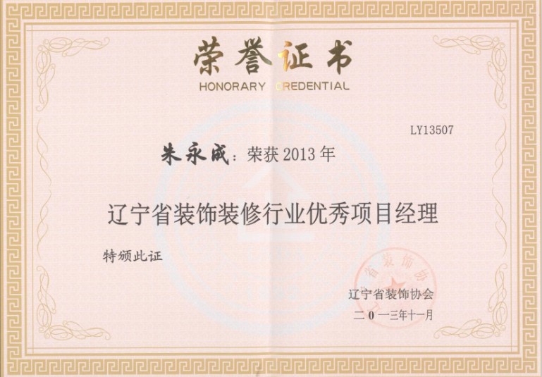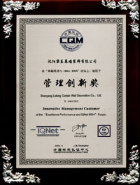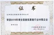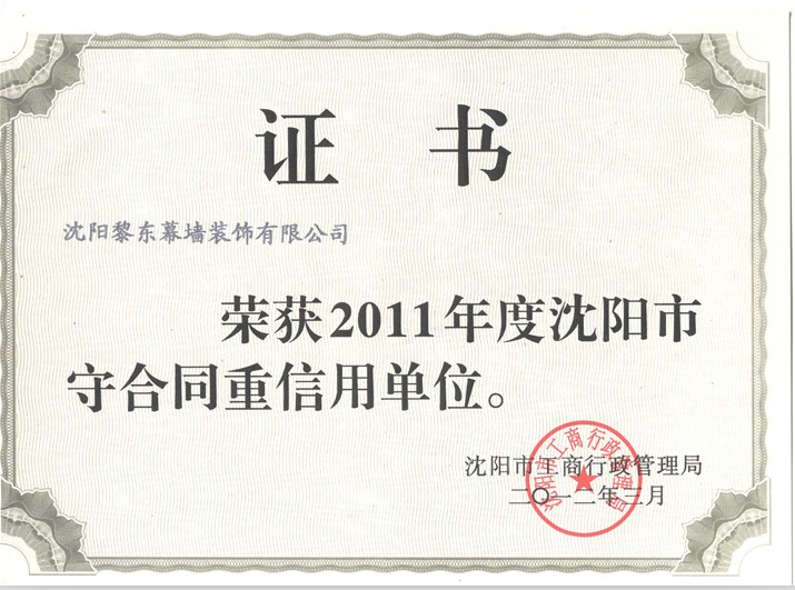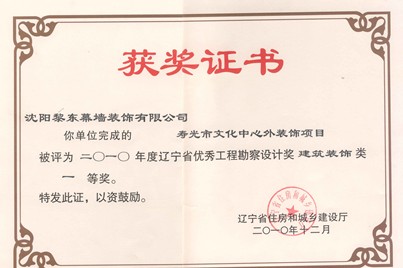 | 2010年榮獲遼寧省裝飾裝修行業(yè)優(yōu)秀企業(yè)家 | 2012年榮獲全國建筑幕墻行業(yè)50強(qiáng)企業(yè) | 2012年榮獲沈陽市守合同重信用單位 |