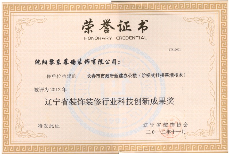 | 2011年榮獲沈陽市守合同重信用單位 | 2012年嘉里中心榮獲安全生產(chǎn)文明施工達(dá)標(biāo)單位 | 2012年長春市市政府新建辦公樓榮獲遼寧省裝飾裝修行業(yè)科技創(chuàng)新成果獎(jiǎng) |